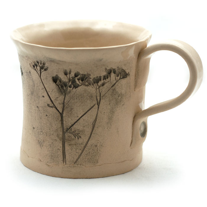 Kubek z odciskanymi roślinami, z delikatnymi wgnieceniami/deformacjami kształtu.